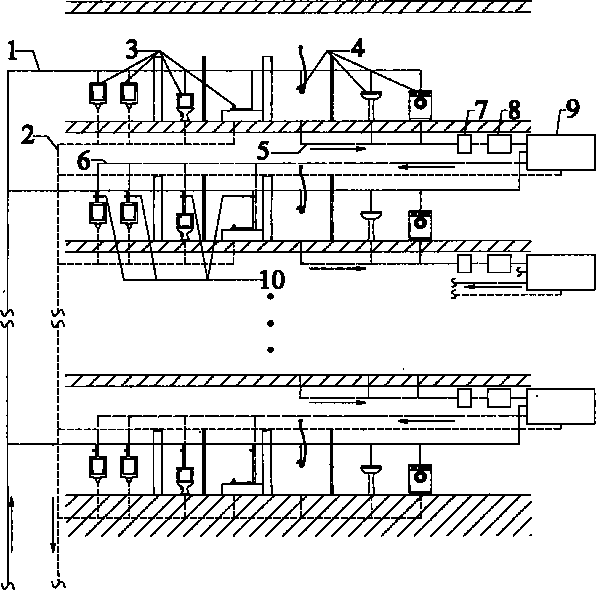 2.要求1所述的樓宇集中式衛浴間廢水利用技術,其特征在于所述設置有樓層間蓄水箱 (9)。