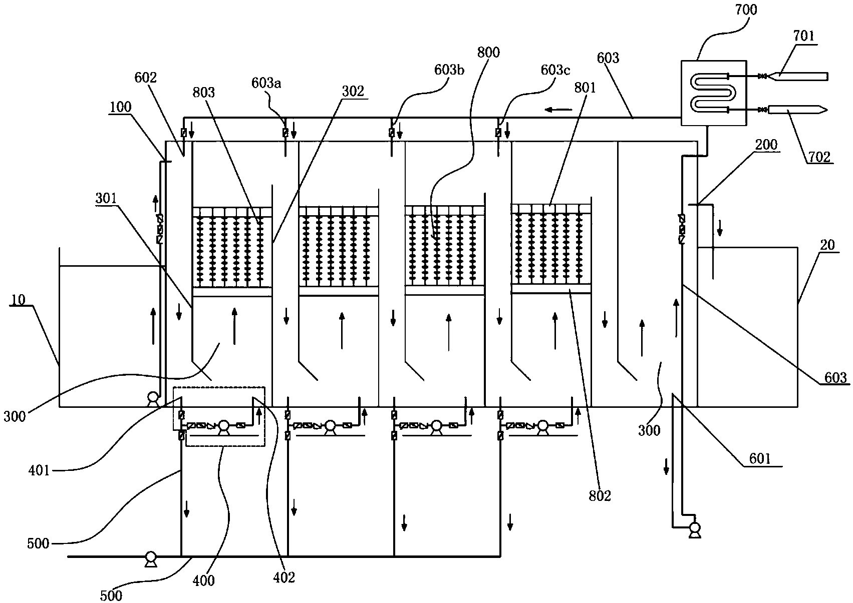 優(yōu)選地,至少部分所述ABR反應(yīng)室設(shè)有單格排泥系統(tǒng),所述單格排泥系統(tǒng) 具有排泥管路,所述排泥管路一端連通至所述ABR反應(yīng)室底部,另一端通入排 泥池,以將所述ABR反應(yīng)室內(nèi)的多余污泥排出至所述排泥池。當(dāng)厭氧折流反應(yīng) 器的進(jìn)水量偏小的情況下,污泥顆粒沉降速度過快,污泥很難通過自流進(jìn)入下一 格ABR反應(yīng)室,簡單的尾部排泥系統(tǒng)難以達(dá)到排盡剩余污泥的目的,而本方案 中增設(shè)單格排泥系統(tǒng),當(dāng)ABR反應(yīng)室內(nèi)污泥沉積過多需要去除,或污泥處理效 果變差需要更換污泥時(shí),采用單格排泥系統(tǒng),最大化減少單格剩余污泥的過量沉 積,為有效污泥提供更多的空間,以達(dá)到更理想的厭氧處理效率和處理效果。