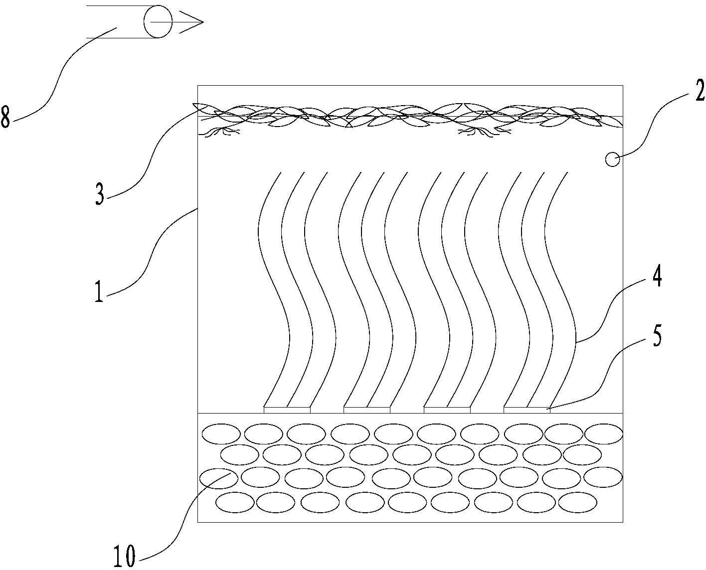 1.三層結(jié)構(gòu)污水凈化槽,包括一個(gè)頂面敞口的槽體(1),其側(cè)壁上部開(kāi)有排水孔(2),其特征是所述的槽體(1)內(nèi)腔中自上而下依次設(shè)置植物層(3)、吸附層和碎石層(10),植物層(3)由可漂浮的浮水植物組成,吸附層由生物漂帶(4)組成,碎石層(10)由鋪設(shè)在槽體內(nèi)腔底面上的碎石堆砌組成。