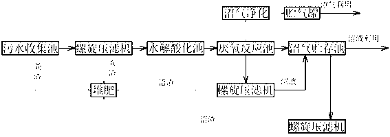 本實用新型的優點在于:利用螺旋壓濾機取代了格柵和沉砂集水池,提高了糞渣、沼渣的濃縮干度,方便糞渣的運輸和利用,也利于沼液的抽排清理。同時,減少占地面積,大大降低了養殖場投資成本,簡化了回收流程,給養殖行業帶來很好的經濟效益和社會效益。