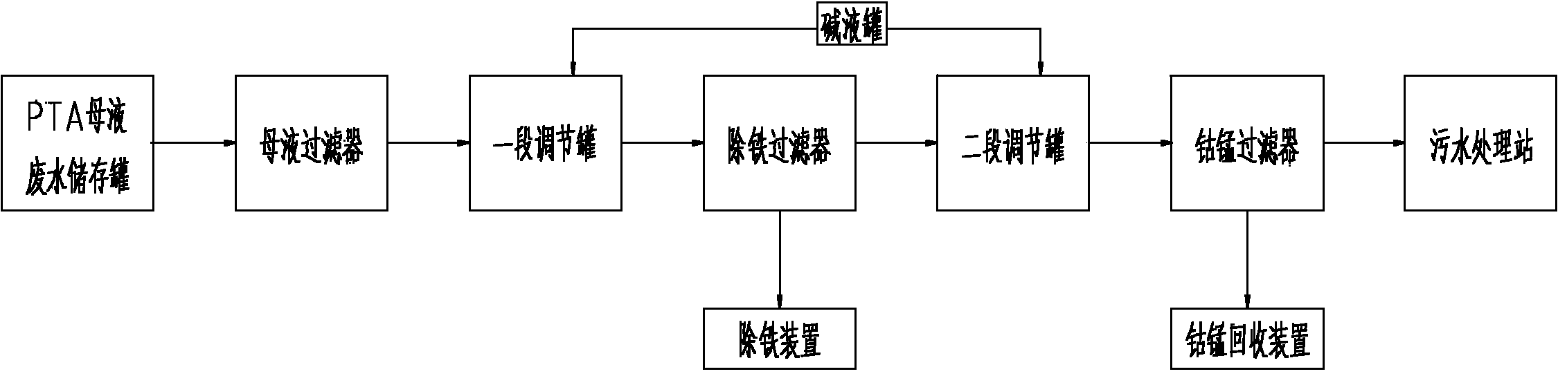 1.一種PTA母液廢水深度處理及鈷錳回收系統(tǒng),其特征在于: 它包括母液過濾器,一段調(diào)節(jié)罐,除鐵過濾器,二段調(diào)節(jié)罐和鈷錳過 濾器,它們依次順序連接,在所述一段調(diào)節(jié)罐和二段調(diào)節(jié)罐之間設(shè)有 堿液罐。