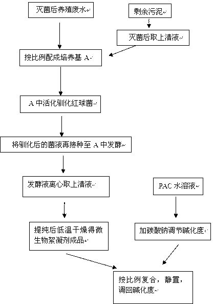 本發(fā)明涉及一種由生物絮凝劑(MBF-R)和聚合氯化鋁(PAC)復(fù)合而成的復(fù)合絮凝劑的制備方法,具體包括:將剩余污泥和養(yǎng)殖廢水分別在高溫滅菌,然后取滅菌后污泥上清液和養(yǎng)殖廢水按比例混合成培養(yǎng)基A,將紅平紅球菌接種至培養(yǎng)基A中活化馴化,馴化后,菌液接種至一個(gè)新的培養(yǎng)基A于發(fā)酵培養(yǎng);直接將離心后的發(fā)酵液上清液與調(diào)好堿化度的PAC按體積比1:(6-11)的比例混合。本發(fā)明方法避免了傳統(tǒng)培養(yǎng)基高成本的不足,產(chǎn)品在酸性pH下也能有較好的絮凝效果,降低了PAC的投加量至少30%,降低了廢水絮凝處理的成本。