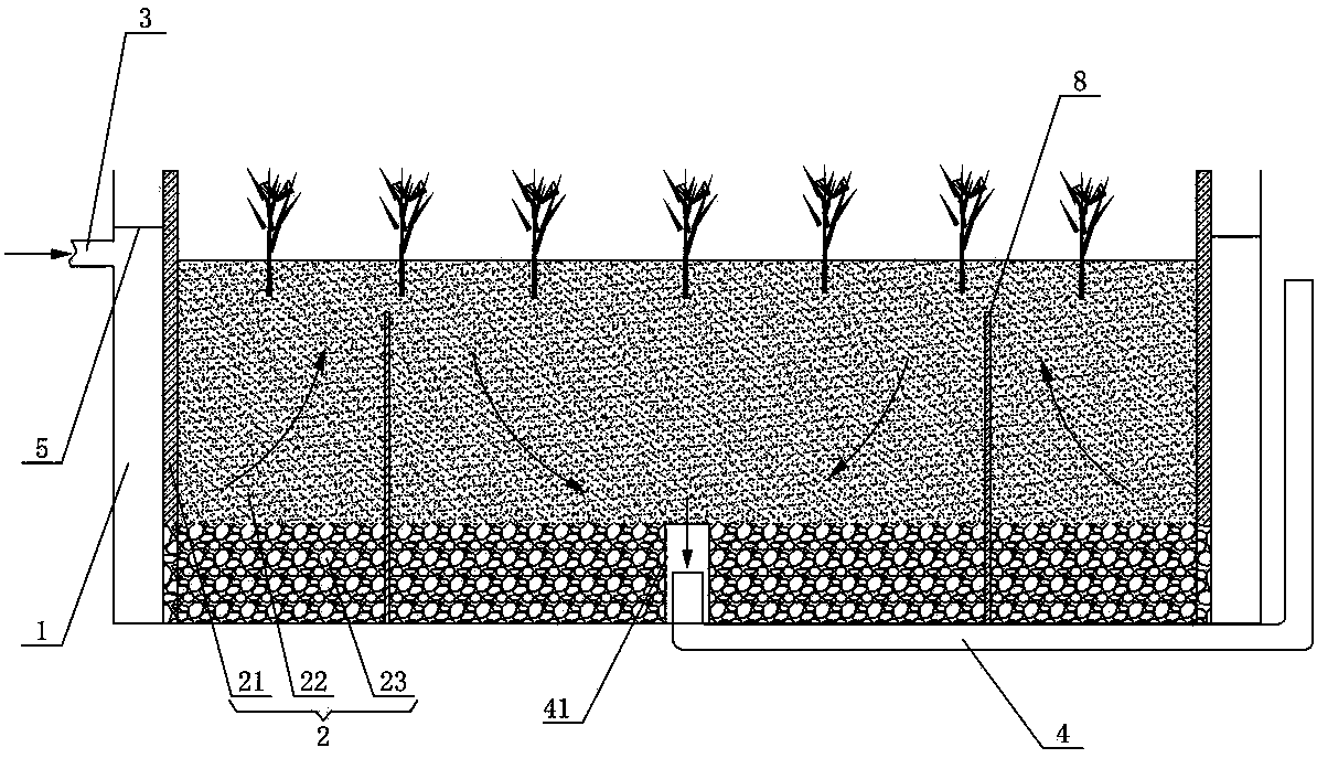 所述人工濕地包括滲濾墻、濕地基質和濕地處理床集水區,所述濕地處理床集水區、濕地基質以及滲濾墻均與圓環形厭氧單元同心設置,所述濕地處理床集水區位于圓環形厭氧單元內圈的底部,所述濕地基質位于濕地處理床集水區頂部,所述滲濾墻環抱于濕地基質外周并與圓環形厭氧單元相貼,所述排水管裝設于濕地處理床集水區底部的圓心處。