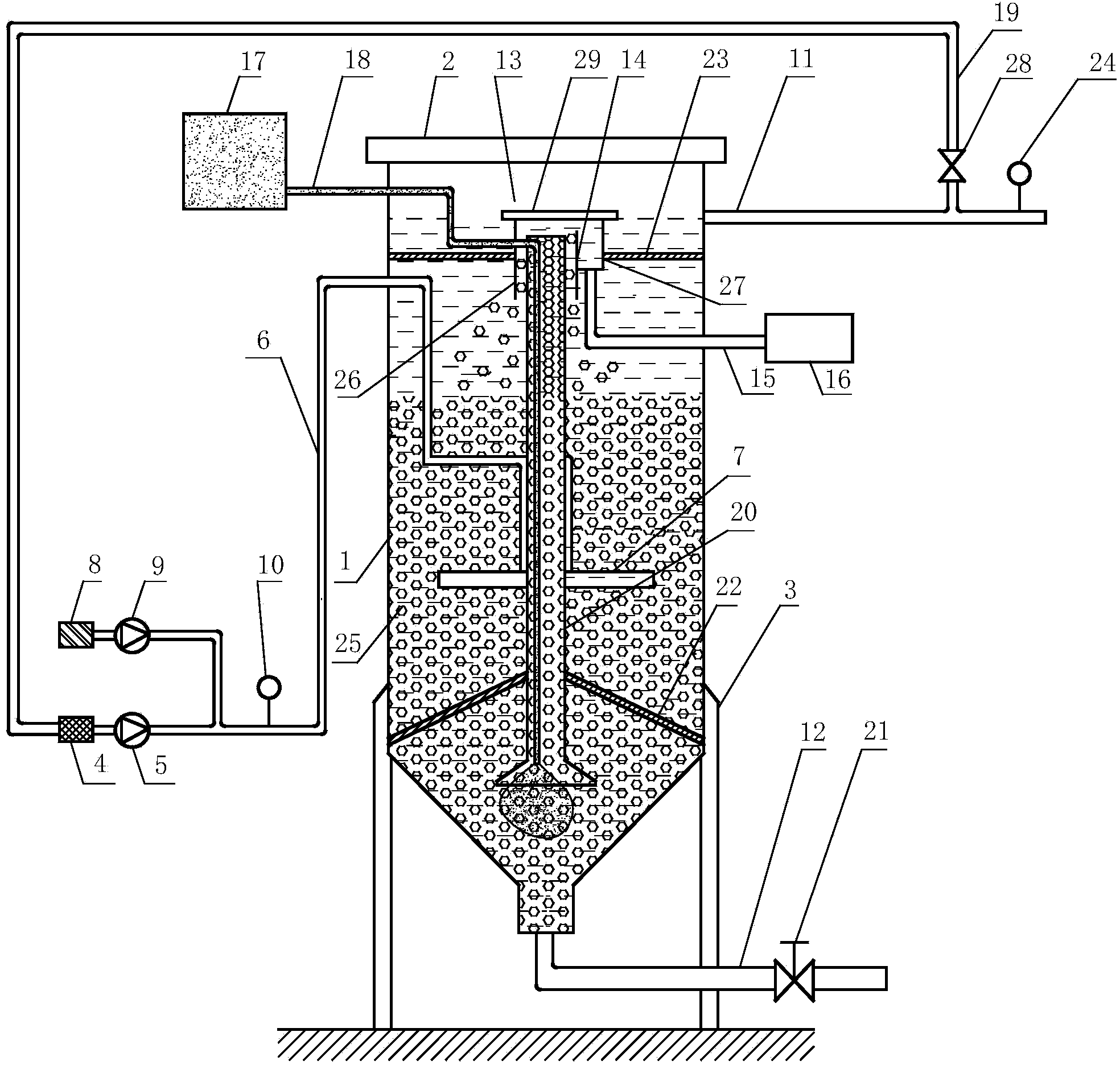(d)、工作階段:開啟加藥泵(9),將儲存在儲藥箱(8)內(nèi)濃度為32%-35%的FeCl3溶液通過進(jìn)水管(6)送入罐體(1)內(nèi),同時開啟進(jìn)水泵(5),將進(jìn)水緩沖箱(4)內(nèi)的 污水通過進(jìn)水管(6)送入罐體(1)內(nèi),從進(jìn)水取樣閥(10)中對進(jìn)入罐體(1)中的污 水取樣,使得進(jìn)水流量中Fe3+的濃度保持在4mg/L-6mg/L,同時,開啟空氣壓縮機(jī)(17), 使進(jìn)入罐體(1)中的空氣流量為4L/min-6L/min,壓縮空氣通過供氣管(18)輸送至罐 體(1)的底部,壓縮空氣從供氣管(18)排出后,將罐體(1)底部的石英砂(25)攜 入洗砂氣提通管(20)內(nèi)并沿著洗砂氣提通管(20)向上運動;表面附著了含磷污泥的 石英砂(25)在隨壓縮空氣的氣流向上運動的過程中相互碰撞摩擦,并在排出洗砂氣提 通管(20)后,與洗砂器蓋(29)碰撞摩擦,附著在石英砂(25)表面的含磷污泥在碰 撞摩擦中剝落,通過洗砂器(13)側(cè)壁的排泥堰(14)流入沉淀池(27),然后經(jīng)過排泥 管(15)進(jìn)入污泥收集罐(16)中;洗掉含磷污泥的石英砂(25)經(jīng)過漏砂管(26)落 入罐體(1)中;處理過的污水通過出水管(11)排出,從出水取樣閥(24)取樣檢測排 出水的磷含量,當(dāng)排出水的磷含量小于0.5mg/L時,達(dá)到了排放標(biāo)準(zhǔn),污水被排出罐體 (1);當(dāng)排出水的磷含量大于0.5mg/L時,排出水通過返水管(19)全部返回至進(jìn)水緩 沖箱(4)中,直到排出水的磷含量小于0.5mg/L時,污水被排出罐體(1)。