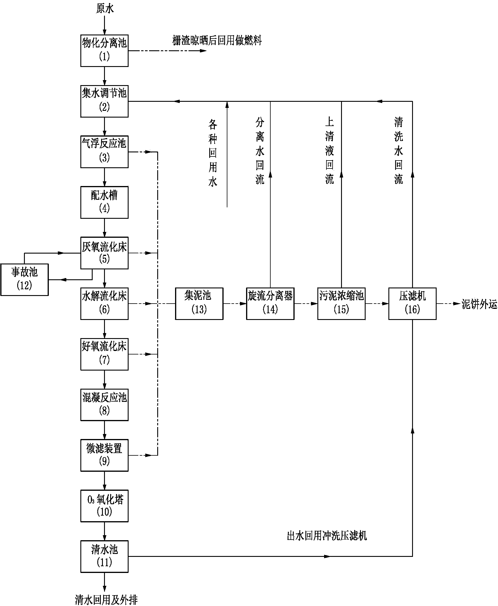 3.根據(jù)權(quán)利要求2所述的人造板廢水處理系統(tǒng),其特征是:所述清水池(11)設(shè)置有出口水路連接至壓濾機(16)對其進行沖洗;所述旋流分離器(14)、污泥濃縮池(15)、壓濾機(16)的水路出口均連接回流至集水調(diào)節(jié)池(2),集水調(diào)節(jié)池(2)還設(shè)置有承接其他各種回用水的入口。