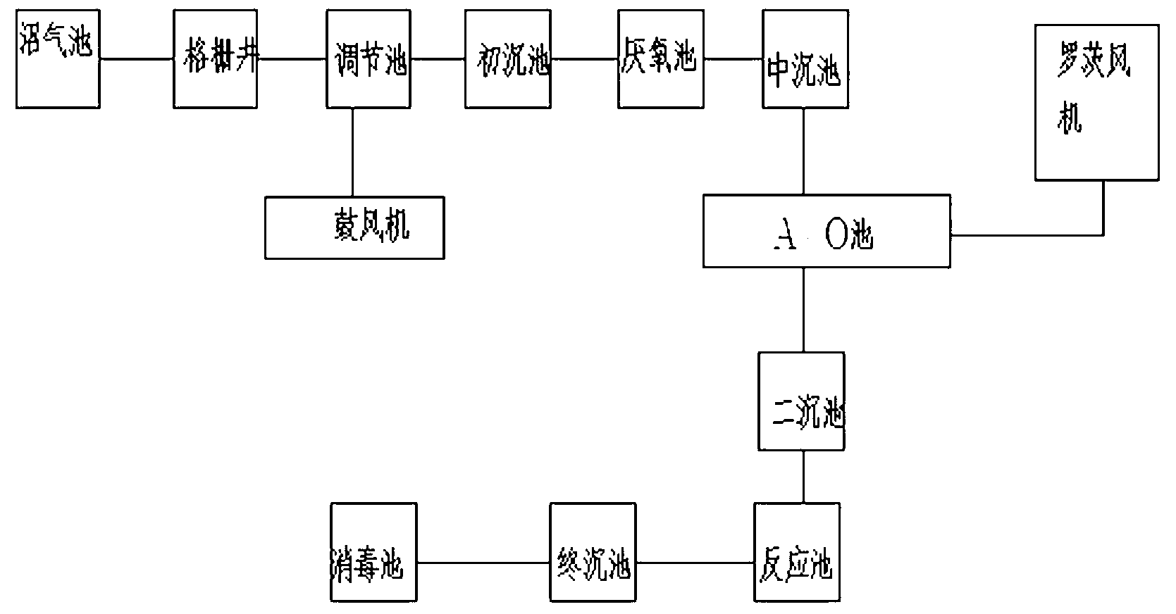 1、養殖廢水首先經過豬場外設置的沼氣池進行初步的厭氧發酵,將大分子物質初步分解。出水進入格柵井,兩道人工格柵分別對懸浮物質進行過濾,除去粗大漂浮物,保護后續工藝中設備的正常運行。然后進入調節池,在調節池中加入氫氧化鈉堿液,同時通用鼓風機對水中的氨氮進行吹脫。在泵的作用下進入初沉池,利用重力的作用,進一步分離去除污水中顆粒較大的懸浮物質,出水自流進入厭氧池,在厭氧池中大分子有機物分解為小分子有機物,提高了廢水的可生化性,去除了廢水中一部分的CODcr及BOD5。厭氧池后設置中沉池,沉淀后的厭氧泥回流至厭氧池,以避免厭氧池的污泥流失。中沉池出水進入A/O池進行生化處理,生化池可去除大部分的SS、CODcr及BOD5,A/O池出水進入二沉池進行沉淀處理。A池中的水由三部分組成,一是中沉池出水,二是由調節池引進的污水,三是加入150噸清水。二沉池中污泥回流至A/O池,剩余污泥排至污泥池。二沉池出水進入反應池,進行絮凝沉淀處理,該化學絮凝法主要是作為污水處理達標排放的保障措施,尤其在冬季氣溫低,生化處理效果降低的情況下使用化學絮凝,能保障污水處理達標排放。絮凝沉淀池出水流入終沉池,沉淀去除由于絮凝反應產生的污泥,出水最后進入消毒池,經過次氯酸鈉消毒殺菌后出水排放流入河流。本發明經A到K步驟處理后,出水水質CODCr≤100mg/L。完全達到國家《污水綜合排放標準》(GB8978-1996)中的第二類污染物最高允許排放濃度中的Ⅰ級標準,而本發明的各個工藝步驟操作簡單,易于控制,人工使用量小,污水經過A到K步驟處理時間大概為3-4天,用到的設備成本低,不用購買大型的污水處理設備,使用壽命長。用于存儲污水的各個池子,都是用混凝土制成,使用壽命長,占地面積小,處理方法對環境無污染,剩下的污泥還可以作為生物有機肥的原料,有利于環保。