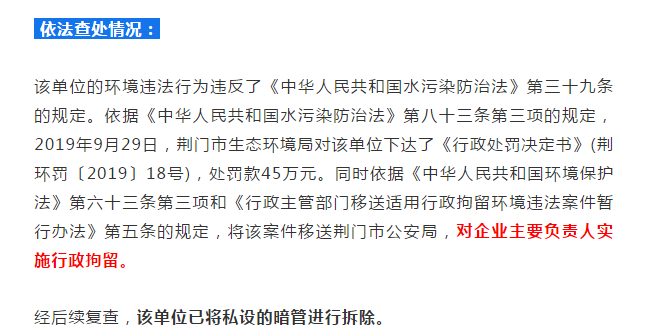 而依據《環境保護法》第六十三條第(三)的規定,企業事業單位和其他生產經營者通過暗管等逃避監管的方式違法排放污染物,尚不構成犯罪的,除依照有關法律法規規定予以處罰外,由縣級以上人民政府環境保護主管部門或者其他有關部門將案件移送公安機關,對其直接負責的主管人員和其他直接責任人員,處十日以上十五日以下拘留;情節較輕的,處五日以上十日以下拘留。