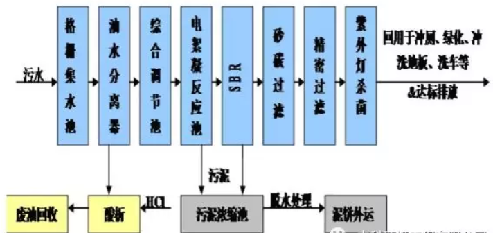 首先對餐館和酒店直接收集的餐飲廢水進行機械除雜質,去除廢水中的骨頭、菜葉甚至洗刷用的布條等較大顆粒物雜質,然后對其進行油水分離。對于含油部分,采用酸析、水洗,得到廢油,其中酸析過程中的加酸量以控制pH值在2~3之間為最佳。油水分離后的水和水洗用水混合后通過調節池均質均量后,經泵提升至電絮凝反應池,以去除大部分SS、油類及有機物,再進行生化處理,生化處理采用SBRS法,占地面積小,處理效率高,出水通過砂碳濾和精密過濾,達到排放標準,可部分直接排放,部分經過紫外燈殺菌消毒后,回用于沖廁所、沖洗地板、綠化等用途。污泥入污泥濃縮池后進行脫水處理,泥餅外運。