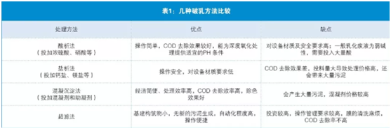 (詳見下表1:幾種破乳方法比較,有酸析法、鹽析法、混凝沉淀法)