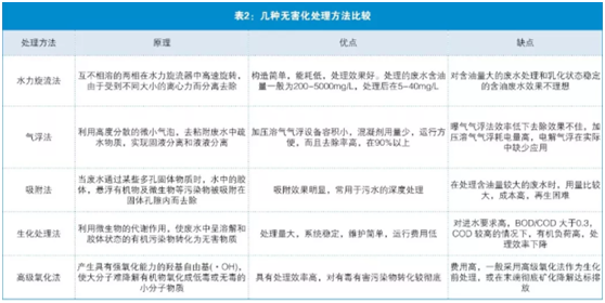 (詳見下表2幾種無害化處理方法比較,有水力旋流法、氣浮法、吸附法、生化處理法、高級氧化法)
