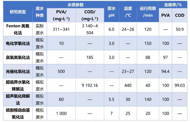 近年來,一些研究人員在利用高級氧化法處理含PVA廢水方面做了一些研究,其主要類型包括Fenton類氧化法、電化學氧化法、臭氧類氧化法、光催化氧化法、超臨界水氧化法、超聲氧化降解法、硫酸根自由基氧化法等。不同類型高級氧化法處理含PVA廢水的效果見表1。