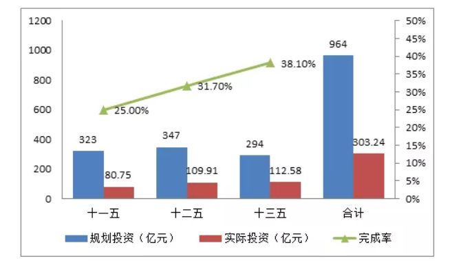 實際投入有多少呢?根據住建部統計年鑒中的數據顯示(圖2是污泥處理處置規劃投資與實際投資對比圖),“十二五”期間我國我污泥的固定資產投資只有110億元,僅完成了31.7%的指標,這正好與我國“十二五”末31%-35%的污泥無害化處理處置率相吻合。而在“十一五”期間,污泥處理處置問題還沒有引起足夠的重視,所以實際投資率更低,按25%的投資率估算,“十一五”期間我們估計約投資80億元,所以“十一五”、“十二五”污泥處理處置的總投資不超過200億元,僅不到計劃規劃投資的30%;預計“十三五”末投資額達到113億元,仍然不能完成目標投資。