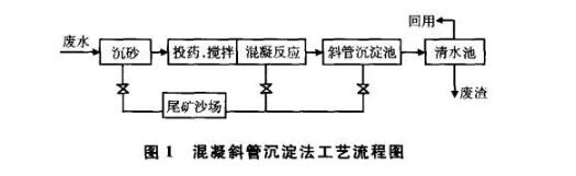 來(lái)自車間的廢水,首先通過(guò)沉砂池進(jìn)行固液分離,沉砂池沉砂通過(guò)卸砂門(mén)排入尾礦砂場(chǎng)。沉砂池溢流出的上清液,通過(guò)投藥混合后進(jìn)入反應(yīng)器充分混凝反應(yīng),然后流入斜管沉淀器,使細(xì)粒懸浮物、有害物進(jìn)一步去除,斜管沉淀器的沉泥,通過(guò)閥門(mén)排至尾礦砂場(chǎng)。通過(guò)此工藝后,廢水即達(dá)國(guó)家允許排放標(biāo)準(zhǔn)。根據(jù)環(huán)保的要求,斜管沉淀器出水進(jìn)入清水池,用清水泵打回車間回用,節(jié)約用水,并使廢水閉路循環(huán),實(shí)現(xiàn)零排放。其工藝流程如圖1。