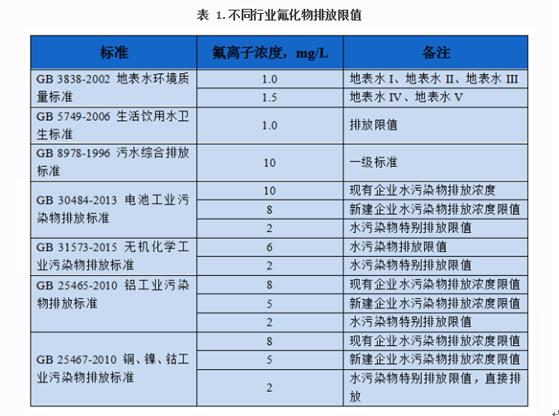 地表水、生活飲用水、污水及含氟工業廢水的排放標準如表1所示。