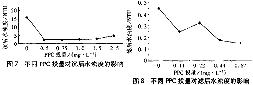 由圖7、8的試驗結(jié)果可見,投加不同量的PPC藥劑均可取得較好的助凝和助濾效果,較單純用聚合鋁處理的沉后水濁度降低了68.7%~85%、濾后水濁度降低了20.5%~54.5%。同時發(fā)現(xiàn)PPC投量<0.5mg/L時,沉后水的濁度隨PPC投量增加而降低,而投量>0.75mg/L時濁度隨PPC投量增加而上升。