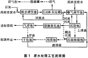 由車間排放的濃廢水自流至濃水調節池,調節pH后由污水泵提升至UASB反應器,出水一部分回流至濃水調節池,它與UASB反應器形成集調節、厭氧降解為一體的處理系統;一部分自流至曝氣調節池與淡廢水混合,經曝氣后由污水泵提升至沉淀池形成一級好氧系統;此時沉淀池出水已近達標,再自流至接觸氧化池、氣浮池進行好氧生化和物化處理(見圖1)。