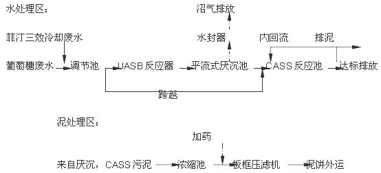 由于葡萄糖廠的生產廢水有機物濃度高,無毒,其可生化性BOD5/CODcr大于0.5,屬高濃度易生化有機廢水,故應采用以厭氧生物處理為主的廢水治理工藝。考慮到廢水COD濃度高達4,500mg/L,為了減少處理系統能耗,采用UASB+CASS 處理工藝。其工藝流程見圖1。