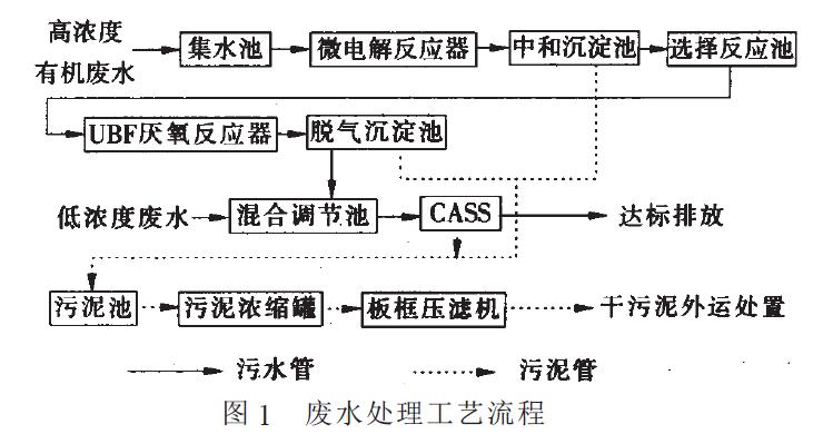 生產(chǎn)過程中產(chǎn)生的高濃度有機廢水匯入集水池 , 由泵提升進入微電解反應器 , 降解大分子有機物 , 提高生化性能 , 然后進入中和沉淀池固液分離后進入選擇反應池與回流污泥混合 , 再用泵提升進入 UBF 厭氧復合床反應器 , 廢水中的有機污染物在厭氧條件下得到降解 , 厭氧出水經(jīng)脫氣沉淀后流入混合調(diào)節(jié)池。低濃度廢水也匯入其中 , 再用泵提升進入 CASS 反應器 , 經(jīng)進一步好氧生化降解沉淀處理后達標排放。
