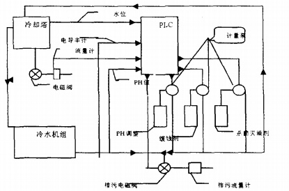 系統(tǒng)智能控制過程模擬:當(dāng)補水流量達到一定值(如1噸,由水處理方案確定,這里只是假設(shè),下同)。提供一信號給PLC,PLC發(fā)出指令,緩蝕阻垢劑流量泵開啟定量加藥(如1分鐘>;殺菌滅藻劑由PLC定時(如6小時)加藥一次;電導(dǎo)率偏離值達到一定程度(如超過設(shè)定值10%以上),給PLC一個信號,PLC就開啟排污閥(如1分鐘),循環(huán)直至電導(dǎo)率達到要求。PH值可采用與電導(dǎo)率相同的控制辦法。