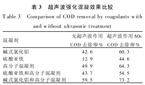 表2結果表明,先施加超聲波再加混凝劑對廢水中COD的去除效果明顯優于先加混凝劑后施加超聲波,且混凝沉淀體積較小.可見當投加混凝劑后,超聲波的作用使已聚集的較粗大的顆粒被擊碎,而凝聚的較小顆粒則又變得難以沉降.而先施加超聲波,可使廢水中有機物的熱運動加快、比表面提高,有機組分與混凝劑碰撞形成共沉淀的速率提高,從而提高了COD去除率.