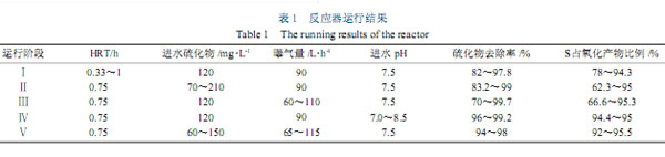 (2)對于好氧升流式流化床反應器,在一定范圍內,當其他影響因素確定時,即給定某個HRT、進水硫化物濃度、曝氣量和進水pH值,都可以通過調整,使得反應器處理硫化物的去除率達到95%以上,同時氧化產物中S占的比例超過93%,有機物的去除率在25%左右。