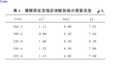 稀鉻酸由循環以100L/h體積流量進入薄膜蒸發器的下部,形成膜狀并被蒸汽加熱汽化。濃鉻酸和二次蒸汽混合物經旋風分離器分離,二次蒸汽從頂部進入冷凝器冷凝成蒸餾水,流入蒸餾水儲槽用于配置NaOH溶液;濃鉻酸經旋風分離器底部流入鉻酸儲槽,再次由循環送入薄膜蒸發器,直到ρ(CrO3)=300~350g/L后,送蒸發罐進一步濃縮。每d能蒸發300~400L稀鉻酸,需冷卻水6~8m3,冷卻后水溫能達60℃以上,可做浴室用水。薄膜蒸發后的鉻酸化學組成列于表4。