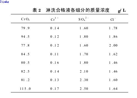 一般用8個床體積的100g/L的NaOH溶液,淋洗可告完成。Na2CrO4絕大部分集中在前4個床體積的淋洗液中,后4個床體積的淋洗液中ρ(CrO3)較低,在工業生產中,將其視為貧液作為下次淋洗時的貧淋洗劑。正常的淋洗操作,首先采用貧淋洗劑自上而下流過樹脂層,當流出的淋洗液呈橙紅色或pH為7時,將其收集于合格液儲槽;當流出的淋洗液由橙紅色變為橙黃色或pH>9時,將其收集于貧液儲槽,這時淋洗劑改為100g/LNaOH溶液,體積約為合格液的體積。淋洗合格液組分的質量濃度列于表2。