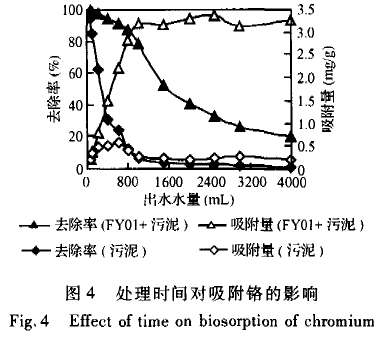 圖5是2種吸附材料處理不同進水流速的電鍍廢水2 h后的實驗結(jié)果。處理的水量隨進水流速的增加而增大,當(dāng)流速達500 mL/h,處理水量達1000 mL后,10 g FY01和5 g污泥的除鉻效率下降速度增快。而在低進水流速時,15 g污泥的除鉻效率降低速度較快。這與}引尼對鉻的吸附容量小、還原解毒能力不足等因素有關(guān) 。