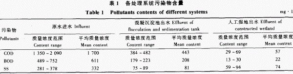 污水處理前COD,BOD和ss平均質(zhì)量濃度分別為1 700,611,332 mg·L~,經(jīng)混凝沉淀和YSH一人工濕地系統(tǒng)后,污染物質(zhì)量濃度降低分別為1 630。580.260 mg·L~.出水質(zhì)量濃度符合DB41/389-2004(河南省造紙工業(yè)水污染物排放標(biāo)準(zhǔn)》中I時段標(biāo)準(zhǔn)(COD≤100 mg·L~,BOD≤40 mg·L~.SS≤100 mg·L )要求,系統(tǒng)運(yùn)行穩(wěn)定,沒有單次超標(biāo)現(xiàn)象.