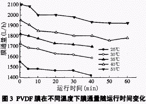 味精間接冷凝水的溫度在40~45℃,而實驗室測試通常在室溫,工程設計需要膜通量隨溫度的變化系數作為參考,以便針對一定的水處理量配備適當的膜組件,圖3是以水為介質,標準PVDF膜組件(4m2/支)在不同溫度下,膜通量隨運行時間的變化情況。從圖中可以看出,保持溫度和跨膜壓差不變時,膜通量隨運行時間變化略有降低,到40min后趨于穩定,初始通量的降低可能是由于膜的壓密造成的,實驗證明膜的通量隨溫度、時間變化是可重復的,因此這種壓密是可恢復的。溫度上升,膜組件通量上升,在較低溫度下通量上升較快,溫度越高通量上升趨于緩慢。每升高1℃,膜通量增長率由25℃時的1.9%降低到50℃ 時的0.9%。
