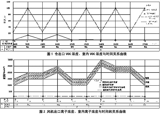 9小時連續運行,臭源VOC濃度周期性變化從25~100ppm,室內則從15~16.7ppm逐漸衰減到0~1ppm;室內測點離子濃度始終保持在160~170Ions/cm3;H2S氣體濃度也保持為0。