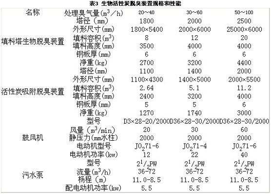 日本某公司生產的生物活性炭脫臭裝置規格和性能見表3所示: