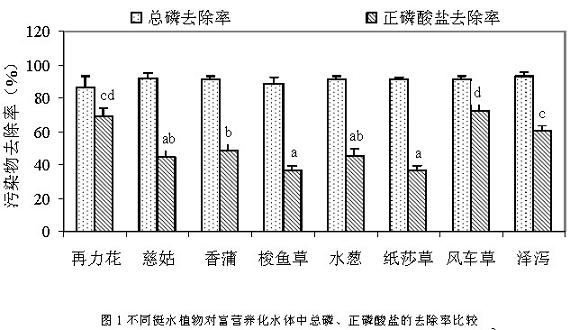 摘 要:為完善水生態(tài)修復(fù)技術(shù),研究了太湖流域常見(jiàn)的八種沉水植物對(duì)富營(yíng)養(yǎng)化水體的凈化效果。通過(guò)室內(nèi)模擬、實(shí)驗(yàn)室測(cè)定,分析了不同種類挺水植物對(duì)水環(huán)境質(zhì)量的改善能力。結(jié)果表明:八種挺水植物均有一定能力去除水體中總磷、正磷酸鹽、總氮、硝氮和葉綠素a。比較分析發(fā)現(xiàn):本試驗(yàn)中,八種挺水植物在去除總磷及總氮上表現(xiàn)為無(wú)顯著差異,P<0.05; 在對(duì)正磷酸鹽的去除率上,再力花、風(fēng)車草、澤瀉的效果較優(yōu);在對(duì)硝氮的去除率上,梭魚(yú)草、再力花、風(fēng)車草的效果較優(yōu);在去除水體中葉綠素a 的能力上,再力花、香蒲、風(fēng)車草的較強(qiáng)。綜合多個(gè)指標(biāo),再力花、風(fēng)車草在各方面表現(xiàn)的能力均較強(qiáng),可作為太湖流域富營(yíng)養(yǎng)化水體修復(fù)優(yōu)先選用的物種。