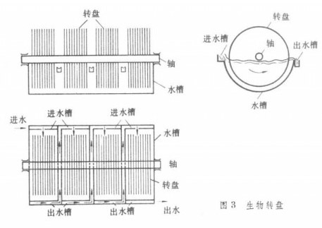 ② 生物轉盤(圖3)。由固定在一橫軸上的若干間距很近的圓盤組成。圓盤面生長有一層生物膜,作用與生物濾池中濾料相似。圓盤是用輕質耐腐蝕、堅固而不易撓折的材料,如泡沫聚氯乙烯、泡沫聚苯乙烯、硬聚氯乙烯、玻璃鋼等材料制成。圓盤有約一半的面積浸在一個半圓形或矩形的水槽內。廢水在槽中流過時,圓盤緩慢轉動。圓盤的一部分浸入廢水時,生物膜吸附廢水中的有機物,使微生物獲得營養。當轉出水面時,生物膜又從大氣中直接吸收氧氣。如此循環反復,廢水中的有機物在需氧微生物的作用下得到氧化分解。圓盤上的生物膜也會因老化不斷地自行脫落,隨水流出,在二次沉淀池中沉淀下來。生物轉盤能處理高濃度廢水,而不會發生堵塞現象。構造與生物轉盤類似的還有生物轉筒。主體裝置是由固定在一橫軸上的若干圓筒組成,圓筒中裝填料,生物膜生長在填料表面。