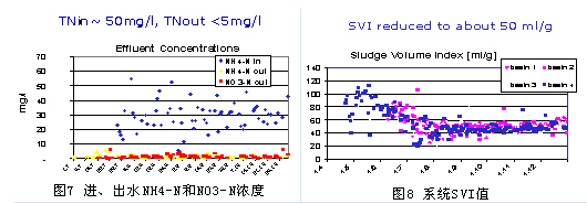 捷克Znojmo污水處理廠 設計平均日處理量為19000 m3/d,最大設計小時流量為1800 m3/h。 在旱流流量條件下循環周期為4小時,在雨天流量下為2.4小時。系統共設4個C-TECH單元,每個池子的長為74m,寬為15.5m,最大設計水深為5.0m。該廠進水總氮濃度在50mg/L左右,通過C-TECH工藝中高超的同步硝化/反硝化過程,其出水總氮濃度維持在5mg/L左右,見圖7。通過選擇器對絮凝性細菌的的選擇作用,系統的污泥沉降指數可降至50ml/g左右,見圖8。