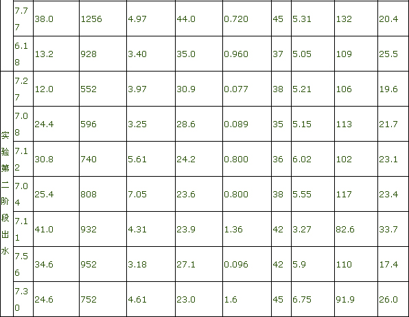 第一階段試驗:污水量1.5m3/h,稀釋水量13-15m3/h,風量500-600m3/h,溫度為20-24℃。