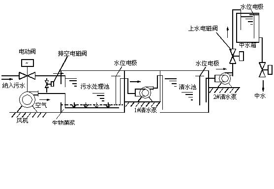 如上所示,當中水箱內水位降至低水位時,2#清水泵又自動起動向中水箱泵水。當污水池中的水位降至低水位時,電動閥門會自動打開繼續向污水池納入污水。如此循環往復。