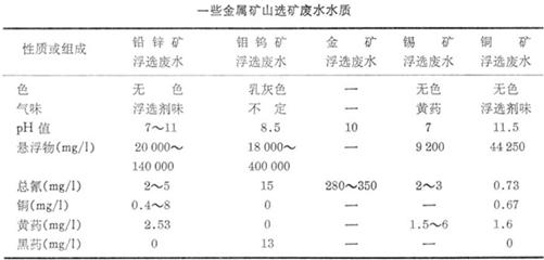 (7)化學耗氧物:化學需氧量是水中的耗氧有機物的量化替代性指標,在選礦廢水中的耗氧物,主要是殘存于水中的選礦藥劑。一些金屬礦山選礦廢水水質如表。