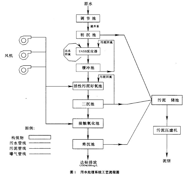 從上表不難看出上流式厭氧污泥床(UASB) 是比較優(yōu)越的處理工藝,在較低的造價(jià)和能耗下不僅有較高的有機(jī)物容積負(fù)荷,而且有很高的處理效率。因此該廠選用上流式厭氧反應(yīng)器作為工藝主體構(gòu)筑物。其構(gòu)造與其它厭氧生物處理裝置的不同之處是:1、廢水由下向上流過反應(yīng)器;2、污泥無需特殊的攪拌設(shè)備;3、反應(yīng)器頂部有特殊的氣、液、固三相分離器。整個(gè)廢水處理工藝采用 “UASB反應(yīng)器+活性污泥曝氣池+接觸氧化池”的處理工藝。廢水處理工藝流程見圖1。