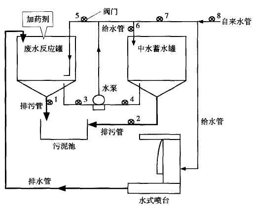 水罐內下部,水管出水口緊貼罐壁,如圖1所示,開啟閥門3和閥門5,啟動水泵,廢水罐內的廢水在水泵的作用下會形成螺旋形的水流,能使藥劑與污水充分混合反應。并經過8h以上的沉淀后,開啟閥門3和閥門6,通過水泵將沉淀后的上部中水提升到蓄水罐儲存。向噴臺供水時,噴臺內的污水經水泵回輸至污水反應罐內,開啟閥門4和閥門7,水泵將蓄水罐中的中水輸送至各個噴臺使用。噴臺內的循環用水經過一段時間的使用后,水分的蒸發會減少,開啟閥門8可以直接向水處理系統補水。同時可以查看中國污水處理工程網更多技術文檔。