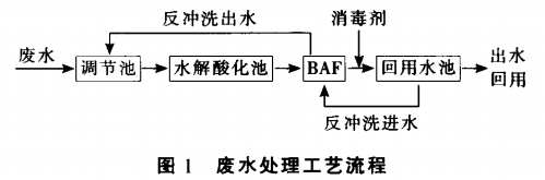 廠區各處的廢水經下水道進入調節水池,調節水池對來自不同區域的廢水進行水質、水量的調節。調節池前設置格柵。廢水再經提升泵進入水解酸化池,來提高廢水的可生化性,減輕后續曝氣生物濾池的沖擊負荷,進而提高曝氣生物濾池的處理效果。經過曝氣生物濾池處理的出水自流入回用水池:反沖洗水經溢流排水槽排至調節池。