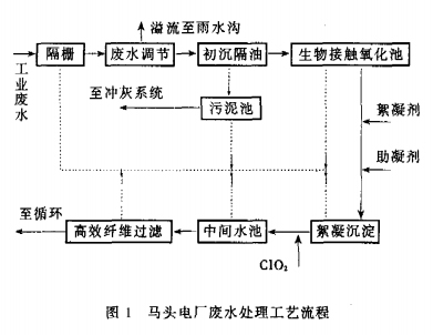 馬頭電廠地處水資源十分貧乏的北方城市。電廠總裝機1000MW,全部為凝汽式發電機組。全廠廠區廢水排放總量約為219萬t/a,廢水未經處理通過廠內地下總排管網自流匯入南北2個集水池,然后通過污水泵排入廠區外排水渠。廠區廢水主要包括生活污水,煤場排水、輸煤棧橋沖洗水等,水質變化較大。電廠從1998年著手開始廢水處理回收工作,并在2002年10月完成可行性研究,2003年完成實施,2004年1月投入運行。