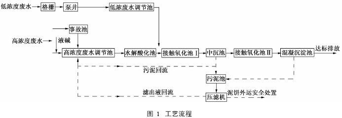 在工藝處理過(guò)程中, 首先將廢水分為高濃度廢水和低濃度廢水, 在酯化和縮聚工段的污水經(jīng)污水道排向污水站, 并設(shè)置兩個(gè)閥門(mén), 將生產(chǎn)異常情況下的特高濃度廢水, 首先進(jìn)入事故池進(jìn)行存放, 等生產(chǎn)恢復(fù)正常后, 再少量、均勻地入調(diào)節(jié)池。高濃度廢水先經(jīng)水解酸化預(yù)處理, 再與低濃度廢水混合, 進(jìn)入接觸氧化池進(jìn)行好氧生化處理, 最后混凝沉淀, 實(shí)現(xiàn)達(dá)標(biāo)排放要求。
