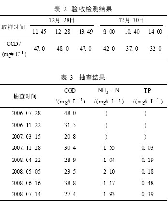 經(jīng)過(guò)約三個(gè)月的調(diào)試和運(yùn)行, 系統(tǒng)處理出水水質(zhì)優(yōu)于設(shè)計(jì)要求, 于2005年12月28日、30日進(jìn)行了驗(yàn)收監(jiān)測(cè), 出水水質(zhì)指標(biāo)摘錄于表2。該套裝置運(yùn)行至今, 運(yùn)行狀況良好, 出水水質(zhì)優(yōu)良, 對(duì)其抽查結(jié)果如表3所示, 現(xiàn)在出水已經(jīng)全部回用于生產(chǎn)和綠化。