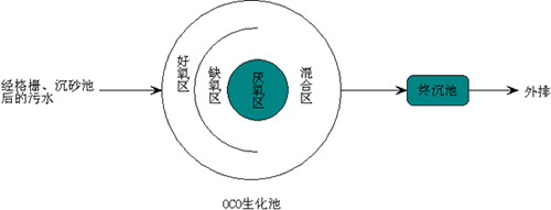 OCO工藝為在上述工藝的基礎上經多年的研究與實踐推出的。OCO工藝是一種A/O脫氮除磷工藝,污水先進入厭氧區(內圈),再進入缺氧區(中圈),然后進入好氧區(外圍),各圈均呈循環流態,其顯著特點是缺氧區與好氧區有一半是合二為一的,它們之間的隔墻呈C字形,三圈隔墻的形狀就像OCO,由此命名。