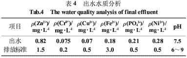 工藝改造完成后,連續試運行90 d,系統運行良好,出水穩定。檢測結果顯示,Cr6+、Fe2+、PO43-、Cu2+等主要污染物的去除效果明顯,各項指標均達到電鍍行業的污染物排放標準(GB 21900-2008)要求(見表4)。