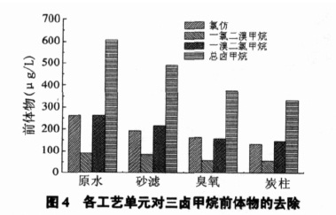 三鹵甲烷被認(rèn)為是氯化形成的主要消毒副產(chǎn)物,我國2005 年實(shí)施的城市供水水質(zhì)標(biāo)準(zhǔn)中規(guī)定三鹵甲烷的質(zhì)量濃度不能超過0.1mg/L。飲用水中檢測到的三鹵甲烷類消毒副產(chǎn)物共有4 種,即氯仿、二氯一溴甲烷、一氯二溴甲烷和溴仿。研究表明,三鹵甲烷的各組分具有明顯的致突變作用,且存在良好的劑量反應(yīng)。本工藝采用的是后加氯,氯化過程中產(chǎn)生的消毒副產(chǎn)物直接進(jìn)入給水管網(wǎng),因此要在給水處理過程中減少其前體物。三鹵甲烷生成勢是指在水樣中加入足夠量有效氯,反應(yīng)足夠長時間生成的三鹵甲烷總量,可以用來描述能夠生成三鹵甲烷的那一部分有機(jī)物。由于原水中溴的含量很低,所以溴仿的量一直低于檢出限。由圖4 可知,常規(guī)工藝對三鹵甲烷前的其它各個組分都有一定的去除率,氯仿前體物為25%,一氯二溴甲烷前體物為9%,一溴二氯甲烷前體物為17%,總?cè)u甲烷前體物為19%。經(jīng)過臭氧單元,三鹵甲烷的各個前體物的總?cè)コ蔬_(dá)23%。生物活性炭對三鹵甲烷前體物的去除率只有11%。有學(xué)者認(rèn)為:原因是粒狀活性炭對三鹵甲烷前體物的去除主要依靠吸附作用,而炭柱內(nèi)的活性炭運(yùn)行一段時間后吸附能力明顯降低。同時,藻類、有機(jī)物等的累積對去除三鹵甲烷的前體物也有負(fù)面影響。