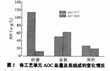 圖5 數(shù)據(jù)顯示,砂濾出水總AOC 為124μg/L,主要成分是AOC-P17,占91%。經(jīng)過臭氧工藝,AOC總值變化不大,降為113μg/L,但AOC-NOX 的百分比迅速上升至55%。該現(xiàn)象說明:臭氧并不能大幅度降低水中AOC 值。相反有些實(shí)驗(yàn)結(jié)果顯示在臭氧投加量較低的情況下,出水的AOC值會有不同程度的升高。雖然臭氧能將一部分有機(jī)物氧化成CO2 和H2O,但總體去除率很低。但臭氧對AOC兩個組分的作用結(jié)果卻不一樣。它使AOC-NOX 顯著增加,這是因?yàn)槌粞跹趸袡C(jī)物的中間產(chǎn)物多是螺旋菌NOX可利用的物質(zhì)。而AOC-P17 反而降低,有學(xué)者認(rèn)為可能是部分P17 菌種利用的營養(yǎng)基質(zhì)被氧化,也可能由于NOX 的營養(yǎng)基質(zhì)增加,增強(qiáng)了NOX 對這兩種菌種交叉利用的營養(yǎng)物的競爭能力,使得AOC-P17 的值下降。