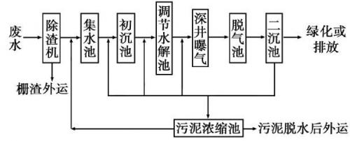 深井曝氣(即超深水曝氣)工藝是采用生物處理為主、物化處理為輔的工藝技術(shù),實(shí)際上是以地下深井作為曝氣池的活性污泥法,曝氣池由下降管及上升管組成。將廢水和污泥引入下降管,在井內(nèi)循環(huán),空氣注入下降管或同時(shí)注入兩管中,混合液則由上升管排至固液分離裝置,廢水循環(huán)是靠上升管和下降管的靜水壓力差進(jìn)行的。其處理工藝流程為:廢水經(jīng)格柵除渣機(jī)去除直徑>1.5mm的大顆粒懸浮物后流入集水池,初步調(diào)節(jié)水質(zhì)水量,再由污水泵提升至初沉池,與二沉池回流污泥混合,利用活性污泥的吸附性和凝聚性去除廢水中SS和有機(jī)物,沉淀污泥入污泥濃縮池,濃縮脫水后外運(yùn);初沉池出水進(jìn)入調(diào)節(jié)水解池,控制池中溶解氧濃度<0.2mg/L,在兼性微生物作用下,廢水中有機(jī)物發(fā)生水解酸化反應(yīng),大分子有機(jī)物降解成小分子有機(jī)物并去除部分COD、BOD,以提高廢水的可生化性。將二沉池剩余污泥回入調(diào)節(jié)水解池,池中設(shè)置曝氣管進(jìn)行預(yù)曝氣和攪拌混合,對(duì)廢水水質(zhì)進(jìn)行調(diào)節(jié)。調(diào)節(jié)池出水自流入深井曝氣池進(jìn)行好氧生化處理,曝氣池深度大,溶解氧濃度高,達(dá)40mg/L~60mg/L,氧化能力極強(qiáng),可快速高效地將廢水中的有機(jī)物氧化分解成CO2、H2O及其他無機(jī)物,化有害為無害,最后處理水進(jìn)入脫氣池脫除粘附在污泥上的微氣泡后在二沉池進(jìn)行固液分離,二沉池出水達(dá)標(biāo)排放或回用于生產(chǎn)和綠化灌溉。二沉池污泥部分通過污泥回流泵回入深井,剩余污泥進(jìn)入污泥濃縮池,濃縮脫水后外運(yùn)(見圖1)。