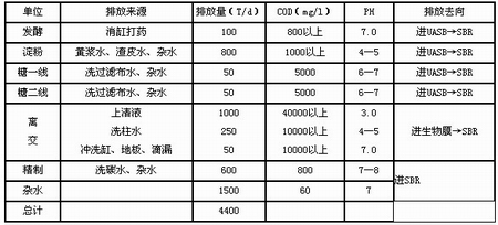 該廠處理的廢水主要為離交尾液;淀粉、制糖中的有機廢水,以及車間來的精制廢水,洗柱水及其他雜水。具體水質(zhì)水量見表1